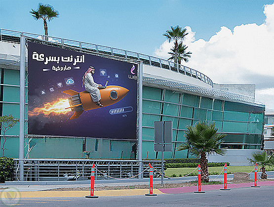 العنصر الرئيسي: شخصية خليجية تستقل صاروخًا متوهجًا، في إشارة إلى السرعة الخرافية للإنترنت.