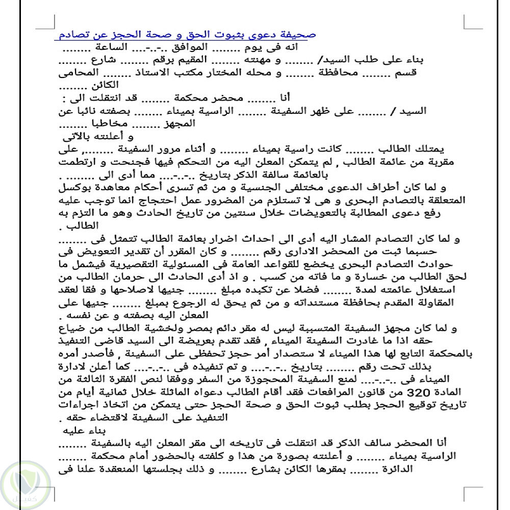 نموذج لصحيفة دعوى بثبوت الحق و صحة الحجز عن تصادم