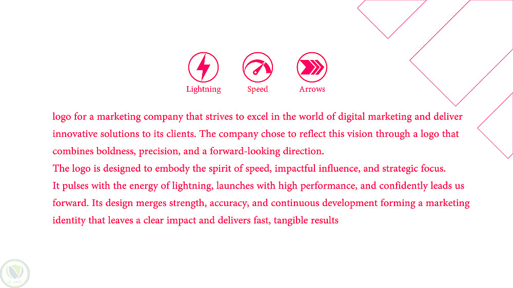 الشعار ينبض بطاقة البرق، وينطلق بسرعة الأداء، ويقودنا بثقة نحو الأمام. تصميمه يجمع بين القوة والدقة والتطوّر المستمر، ليجسّد هوية تسويقية تترك أثرًا واضحًا وتحقق نتائج ملموسة بسرعة.