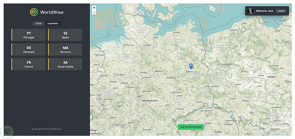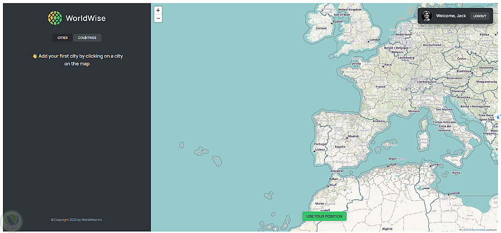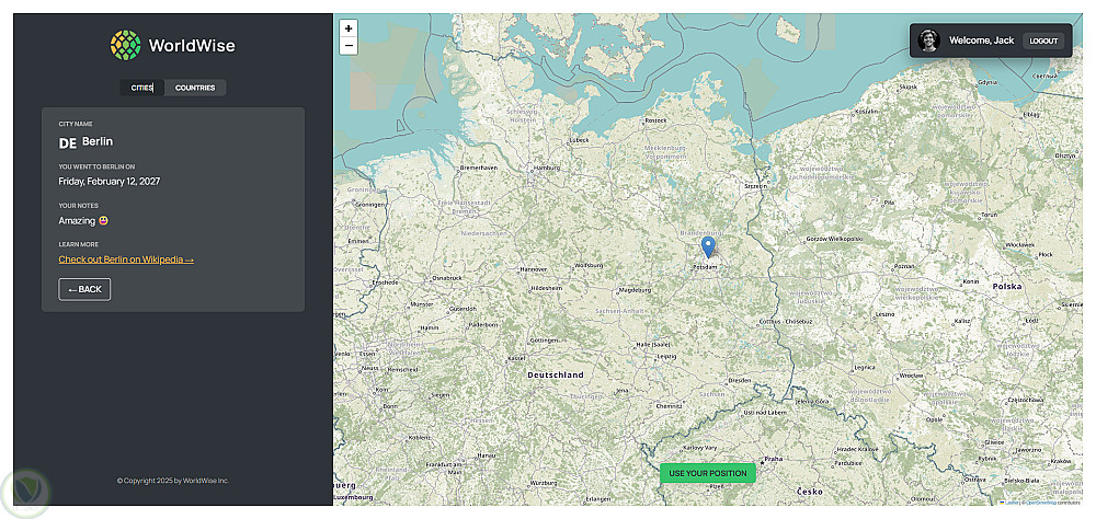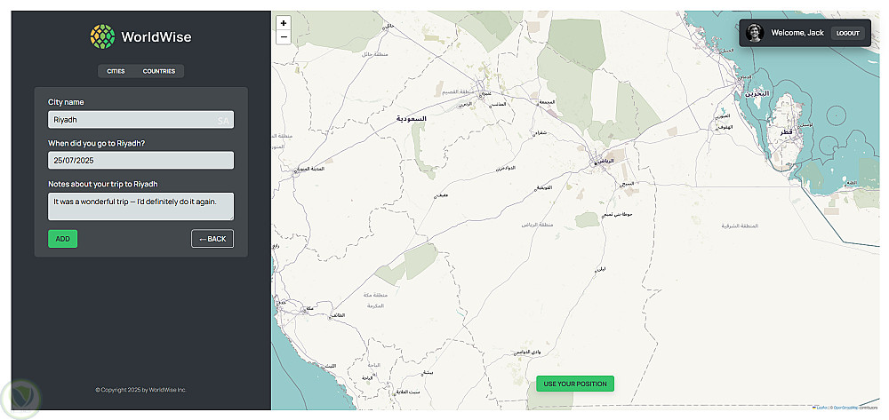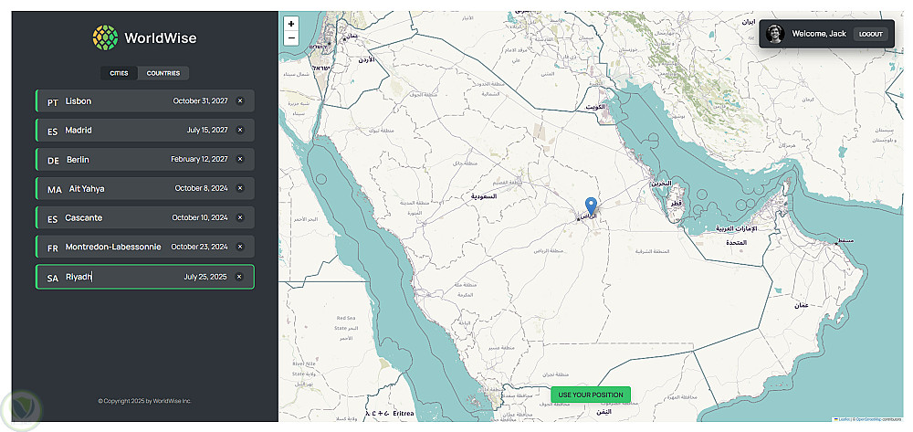 قمت بتطوير هذا التطبيق لتوثيق كل ما يتعلق برحلتي. يوفّر التطبيق خريطة تتيح اختيار أي مدينة من أي دولة، وأعتقد أنه سيساعدني في استرجاع ذكرياتي في أي وقت. كما توفّر الخريطة خيار تحديد الموقع تلقائيًا.