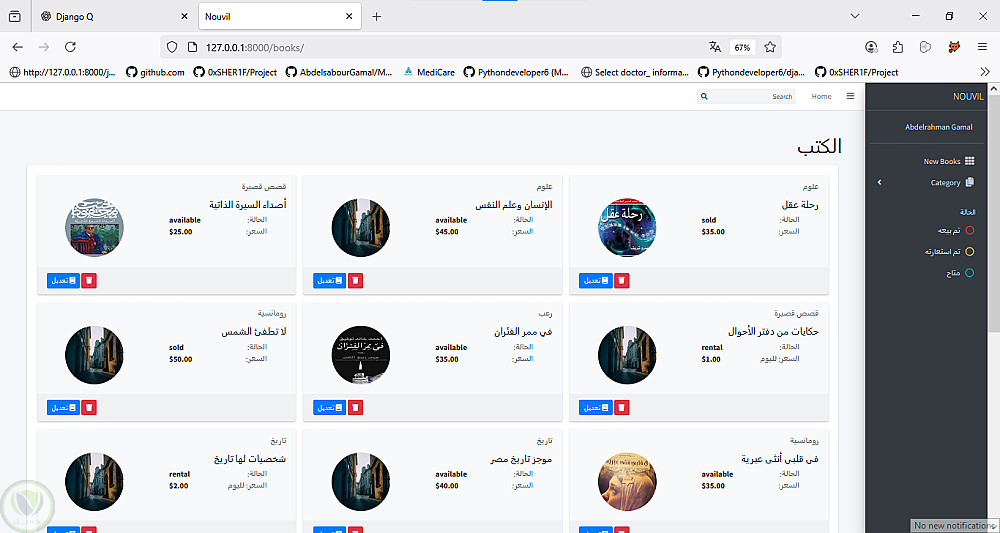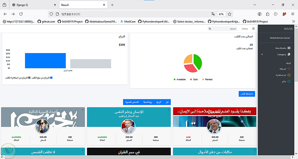 قمت بإنشاء نظام إدارة مكتبة إلكترونية يسمح بإدارة الكتب، عمليات الاستعارة، وتتبع المبيعات باستخدام Python وDjango.
