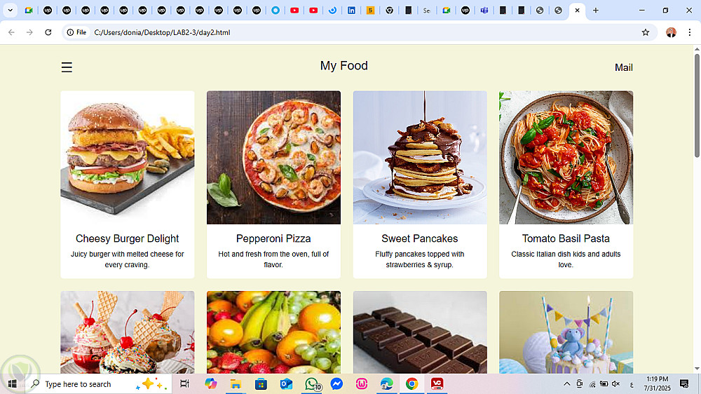 قمت بتطوير واجهة موقع ويب لعرض مجموعة من عناصر الطعام بطريقة منظمة وجذابة بصريًا، مع تصميم متجاوب يناسب مختلف الشاشات.
