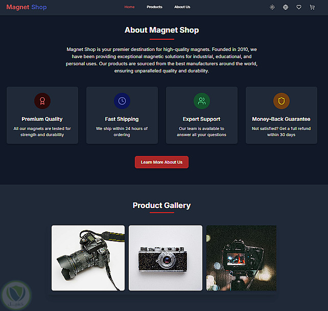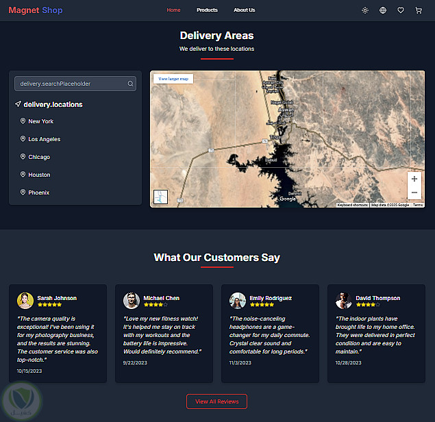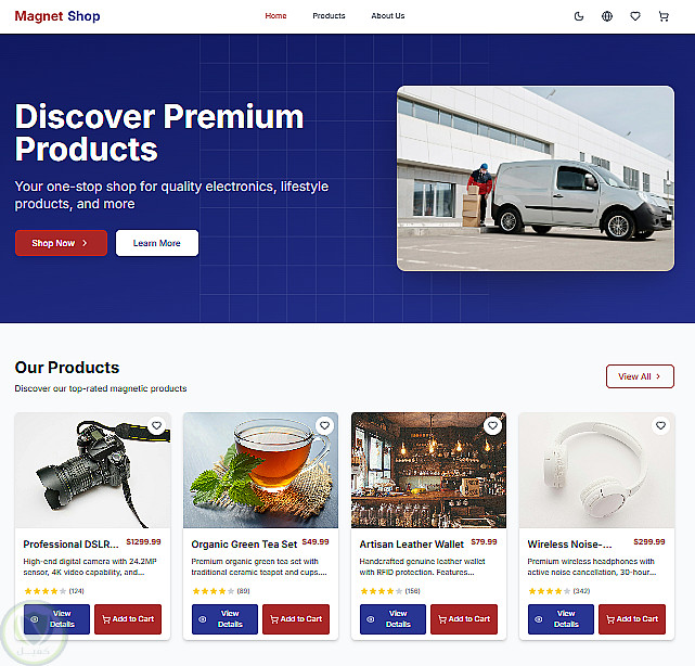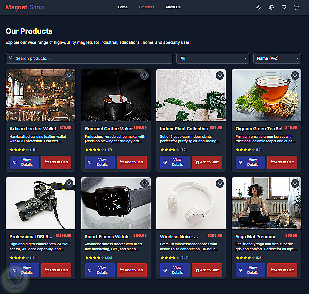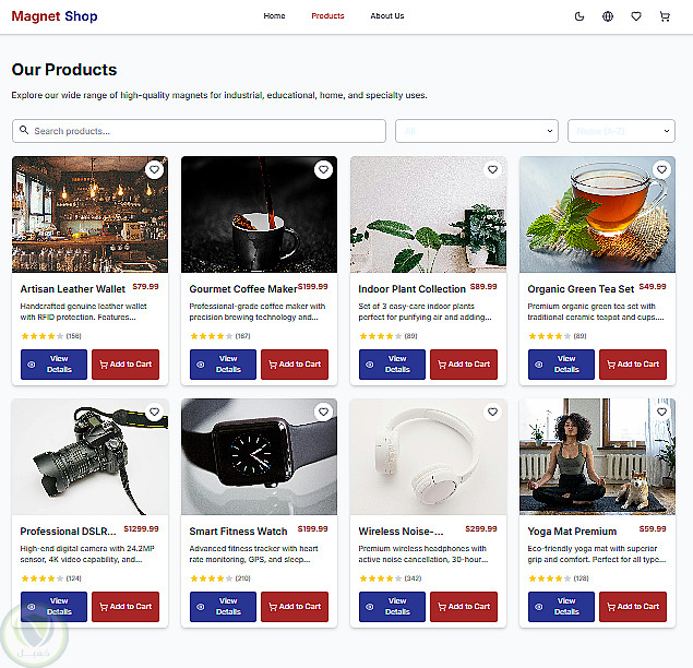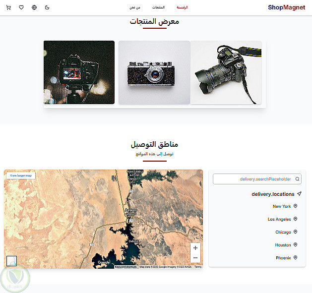 Magnet هو تطبيق ويب للتجارة الإلكترونية متجاوب بالكامل، مبني باستخدام Next.js، ويضم كتالوج منتجات، وسلة تسوق، وقائمة أمنيات، وميزة تتبع الشحنات. يدعم التطبيق اللغتين الإنجليزية والعربية، ويدعم الوضعين الداكن/الفاتح، ويتكامل مع خرائط جوجل لعرض مواقع التوصيل.