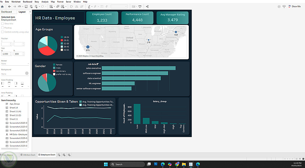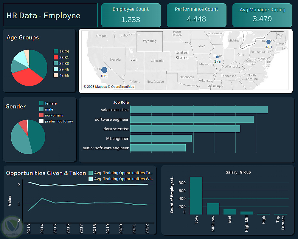 أنشأت لوحة بيانات تفاعلية شملت مخططات دائرية (Pie) ومخططات عمودية وخطية وبطاقات مؤشرات ومخططات خرائطية. ساعدت هذه العناصر على تقسيم الموظفين وفقاً للسن والقسم والراتب، مما مكّن مديري الشركة من الغوص في تفاصيل الأداء وتحديد نقاط الضعف.