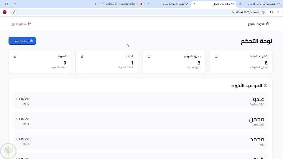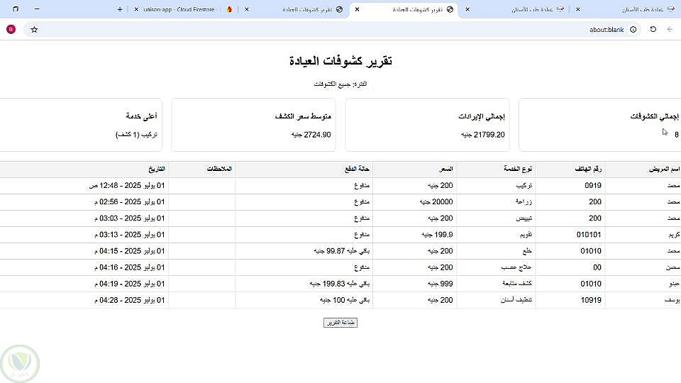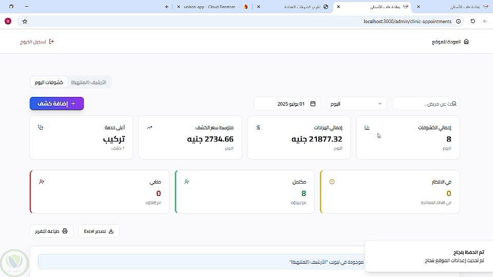 التحكم الكامل في المواعيد، الكشوفات، الدور، والأرباح.