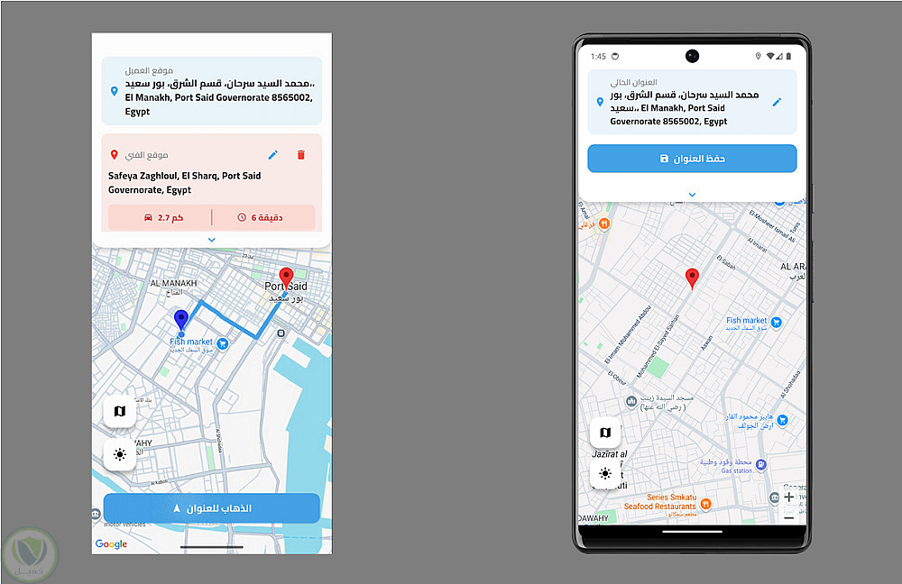 خرائط Google Maps مع نظام تتبع متطور (Routing) لعرض المسافة المتبقية والزمن المتوقع لوصول الفني.