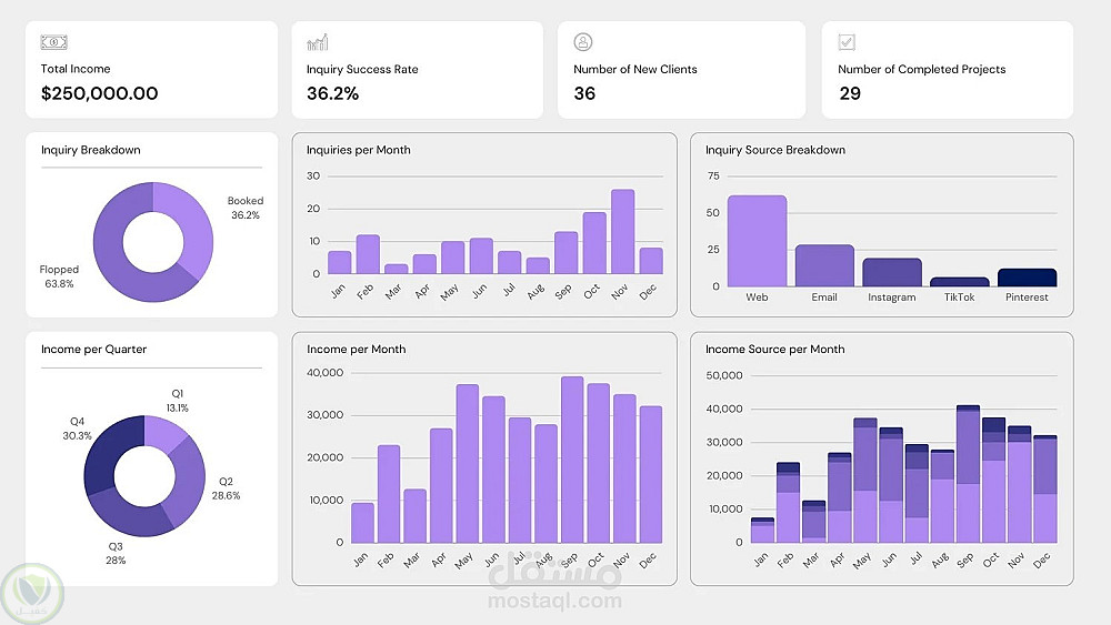 تصميم لوحة بيانات تفاعلية لمتابعة أداء الأعمال السنوي.