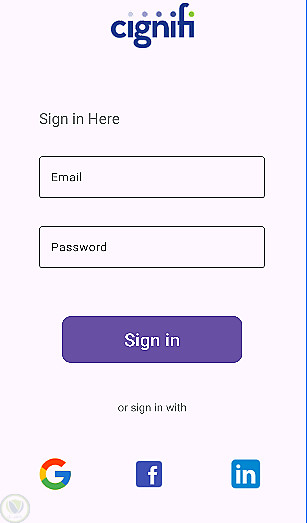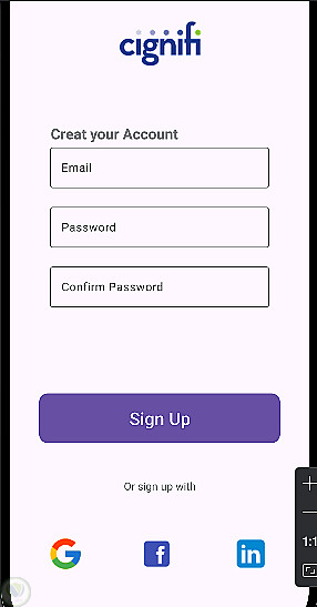 الأزرار كبيرة بزوايا مدورة، مع أيقونات واضحة للتسجيل عبر Google / Facebook / LinkedIn ونصوص انتقال بين الشاشات. التصميم البصري حافظ على لوحة ألوان متناسقة، شعار بارز أعلى الواجهة، وتماسك في الأزرار والحقول والأيقونات.