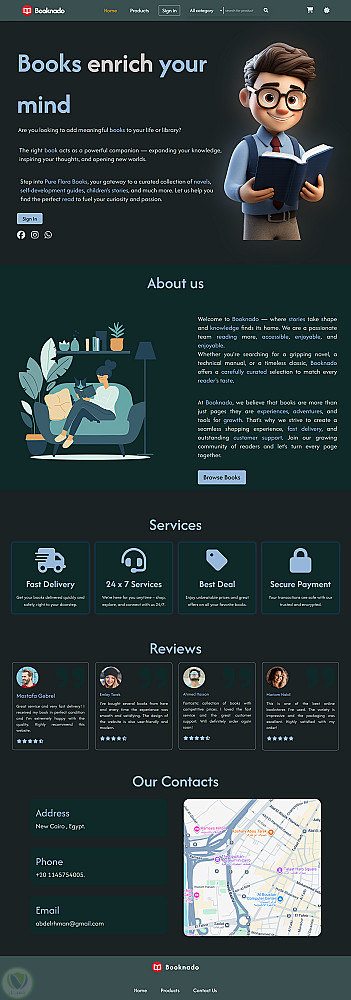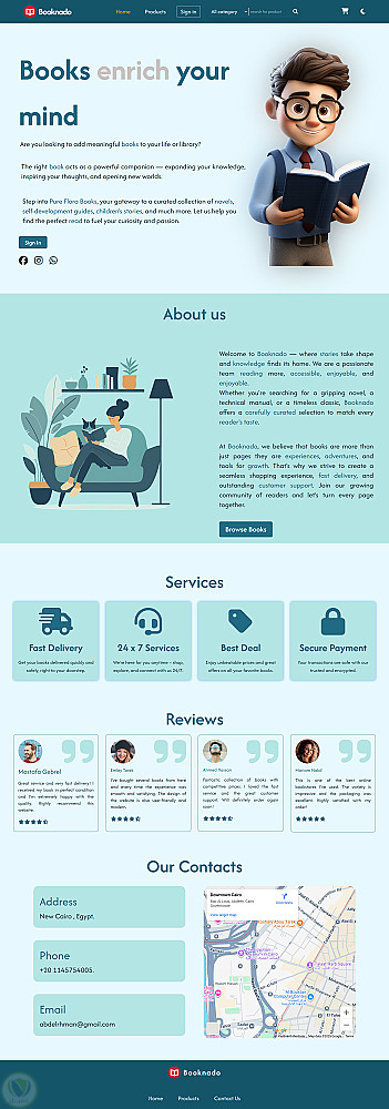 في هذا المشروع قمت بتصميم وتطوير واجهات متجر إلكتروني مخصص لبيع الكتب، يتميز بتجربة مستخدم بسيطة وتنظيم واضح للمحتوى، ويحتوي على الصفحات التالية: