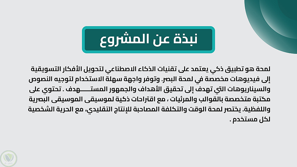 لمحة هو تطبيق ذكي يعتمد على تقنيات الذكاء الاصطناعي لتحويل الأفكار التسويقية إلى فيديوهات مخصصة في لمحة البصر. وتوفر واجهة سهلة الاستخدام لتوجيه النصوص والسيناريوهات التي تهدف إلى تحقيق الأهداف والجمهور المستهدف . تحتوي على مكتبة متخصصة بالقوالب والمرئيات ، مع اقتراحات ذكية لموسيقى الموسيقى البصرية واللفظية. يختصر لمحة الوقت والتكلفة المصاحبة للإنتاج التقليدي، مع الحرية الشخصية لكل مستخدم .