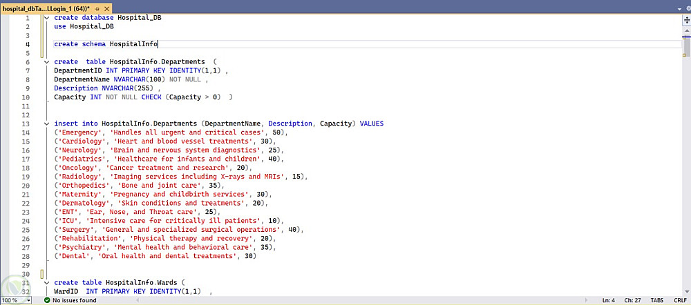إنشاء قاعدة بيانات كاملة لادارة مستشفى باستخدام SQL Server