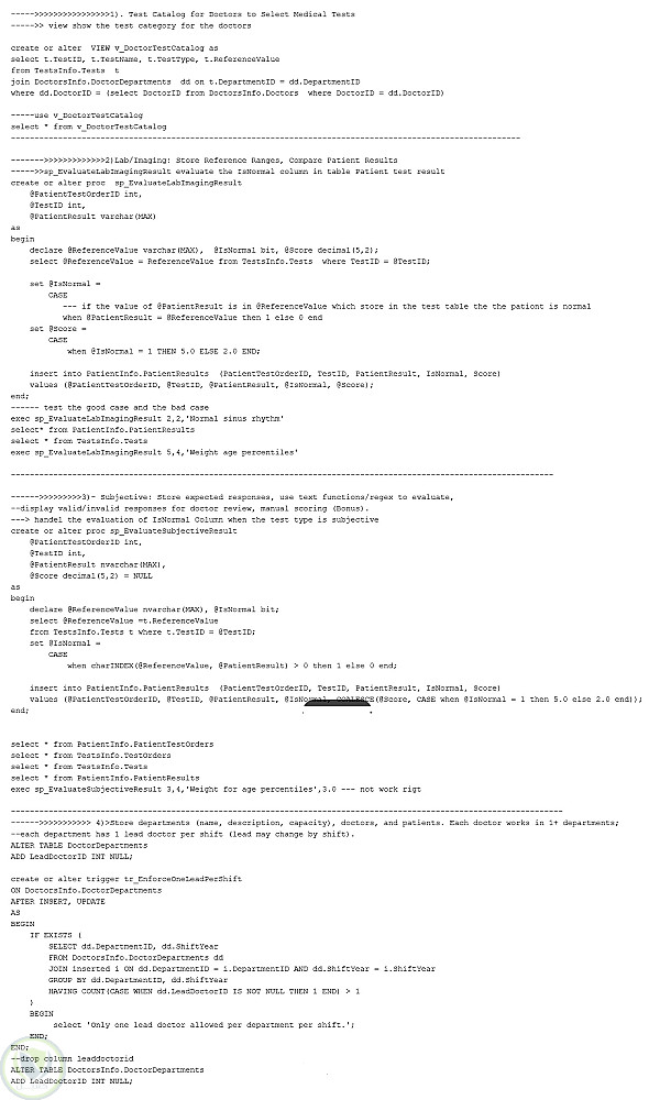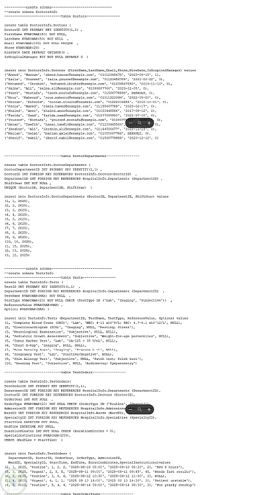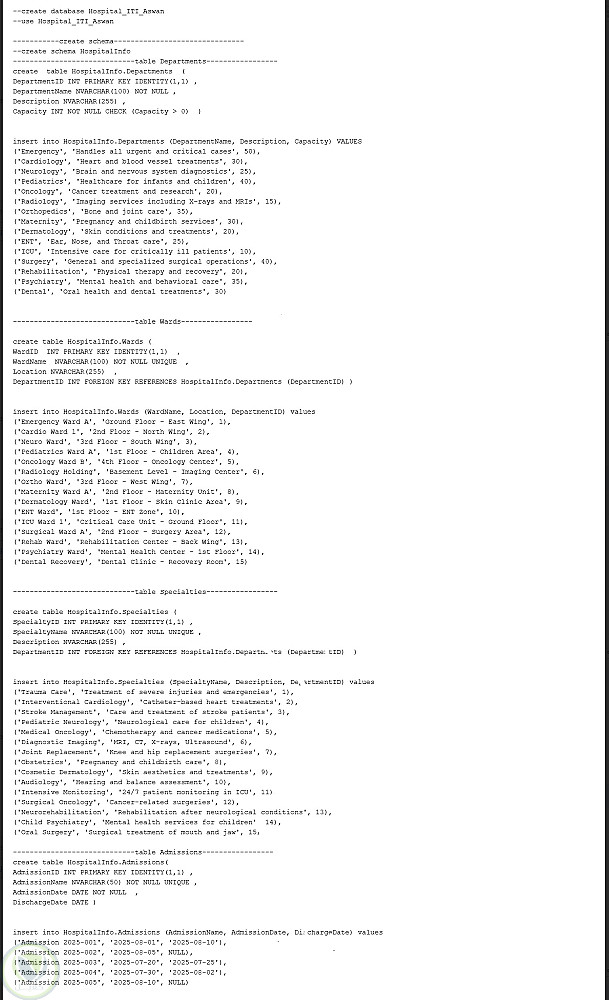 قمت بتصميم وتنفيذ قاعدة بيانات متكاملة لإدارة مستشفى باستخدام SQL Server، بداية من تحليل المتطلبات وحتى التنفيذ العملي.