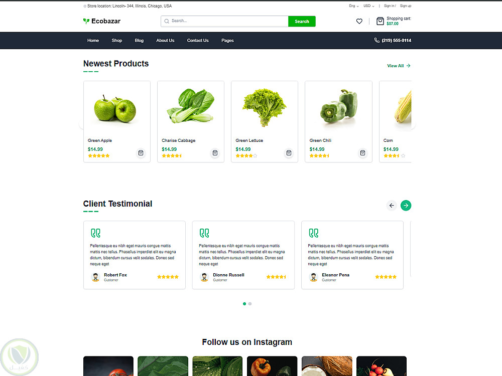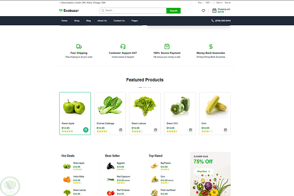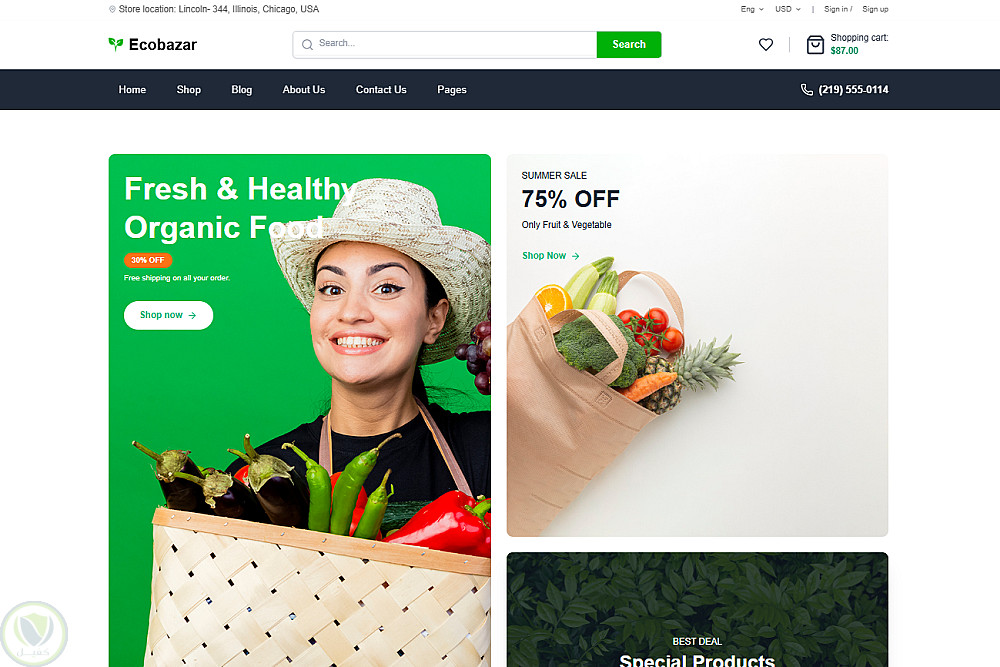 واجهة رئيسية تعرض أقسام متنوعة من المنتجات الطازجة.