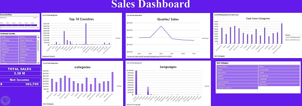 تهدف لوحة تحكم المبيعات التفاعلية إلى تقديم نظرة شاملة لبيانات المبيعات من 2014 إلى 2019، مع التركيز على إجمالي المبيعات، صافي الدخل، وأداء الدول وفئات المنتجات.