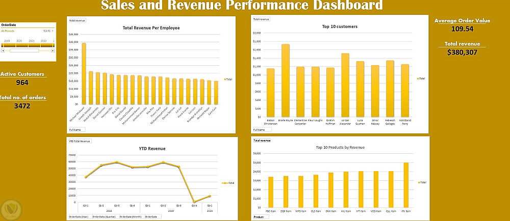 هذه لوحة تحكم لأداء المبيعات والإيرادات، تم إنشاؤها باستخدام برنامج Excel (Power Pivot)، وتتبع المقاييس الرئيسية مثل الإيرادات لكل موظف، المنتجات الأكثر مبيعاً، واتجاهات العملاء.