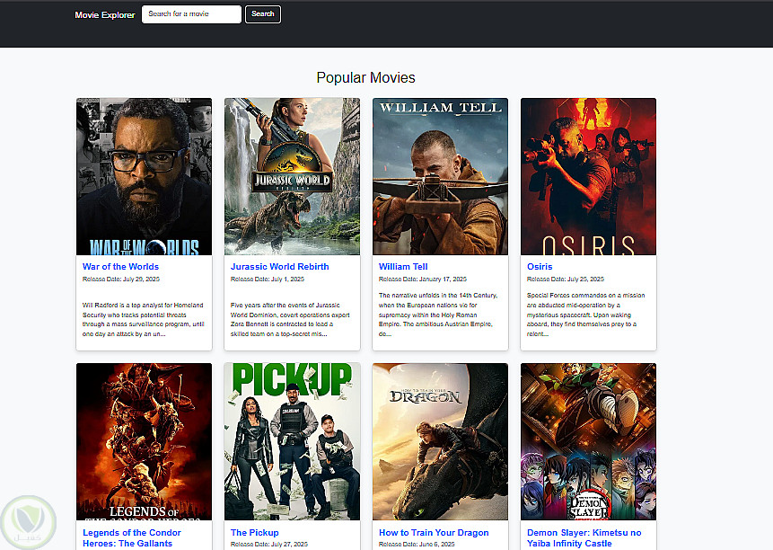 Movie Hub – هو تطبيق ويب تفاعلي يعرض أحدث الأفلام ويتيح للمستخدم تصفحها بسهولة مع عرض التفاصيل الكاملة لكل فيلم (الملصق، التقييم، الملخص، وتاريخ الإصدار).