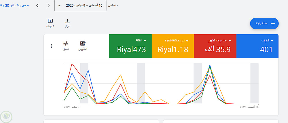 تكلفة النقرة (1.18 ريال) ممتازة لمجال بيع المياه حيث المنافسة متوسطة.