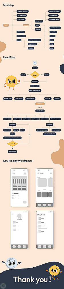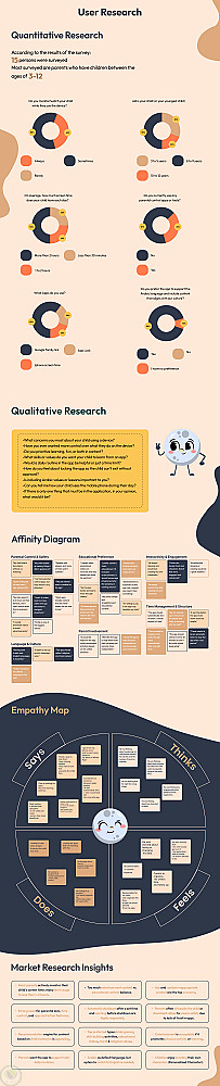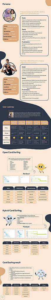 قمنا بتحليل النتائج وصياغة شخصيات المستخدم (Personas) لتجسيد احتياجات الأطفال وأولياء الأمور بشكل عملي، ثم حددنا نقاط الألم والتحديات التي تواجههم في التطبيقات المشابهة. انطلاقًا من ذلك، ابتكرنا مجموعة من الحلول الإبداعية التي توازن بين التعلم المرح وتجربة استخدام سلسة تحافظ على راحة بال الأهل من خلال ميزات مثل التحكم الأبوي، وتوصيات المحتوى المناسبة لكل عمر.