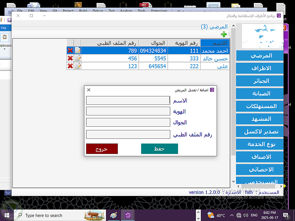 البرنامج فيه اضافة بيانات المريض وتعديل وحذف والعمليات التي تمت مثل الجبائر ، الاطراف ، الصياانة ، ....