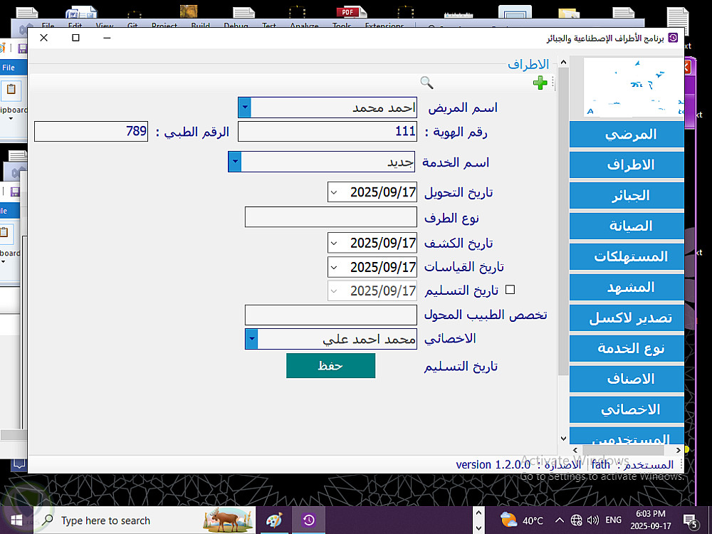 برنامج لتسجيل بيانات مرضي الاطراف الاصطناعية وتسجيل بيانات الاطراف التي تم وصفها لهم من الطبيب وايضا الجبائر التي تم صرفه لهم وايضا اي عمليات تخص الاطراف الاصطناعية