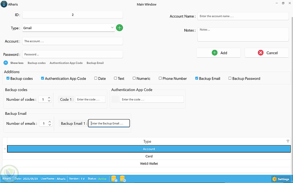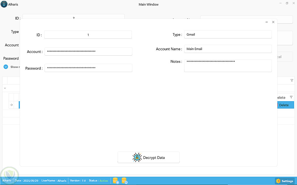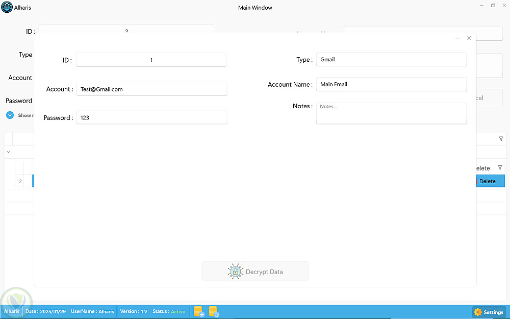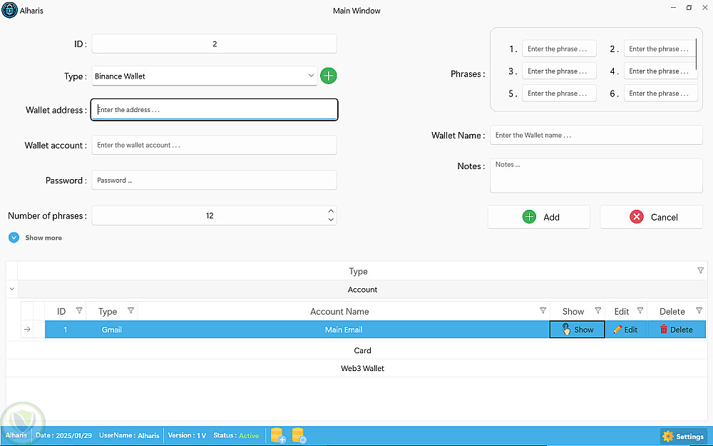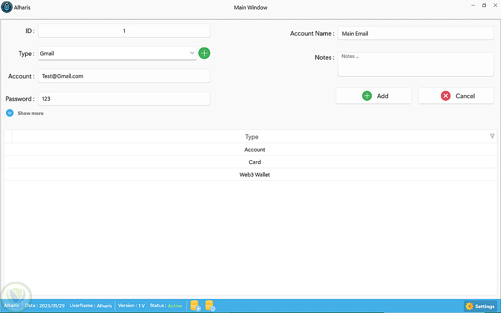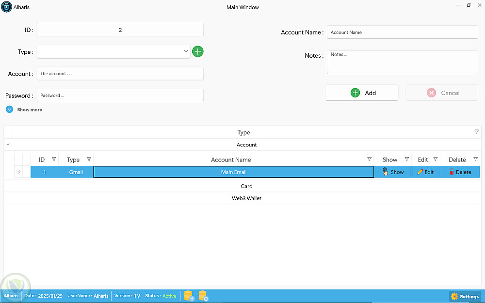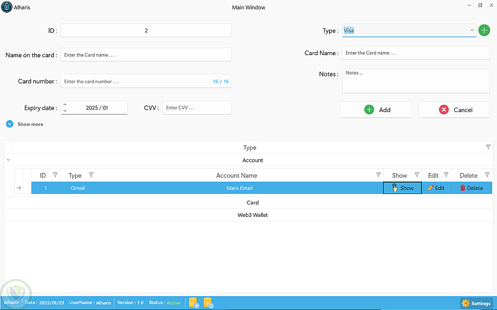 تطبيق آمن لأنظمة ويندوز مطوّر بـ C# و .NET Framework لإدارة المحافظ الرقمية، البطاقات البنكية، وبيانات الحسابات بتشفير عسكري وخيارات تخصيص مرنة.