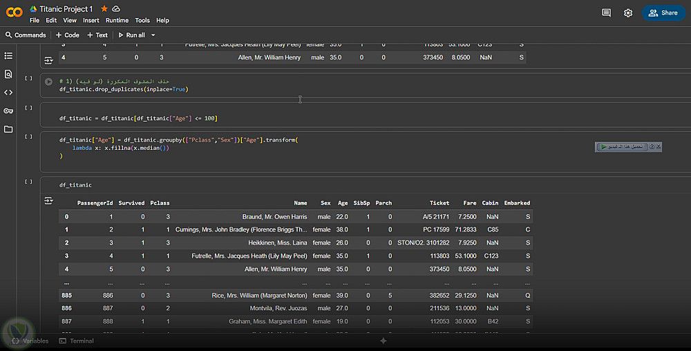 - هندسة الميزات: استخراج ألقاب الركاب من الأسماء وإنشاء ميزات إضافية مفيدة.