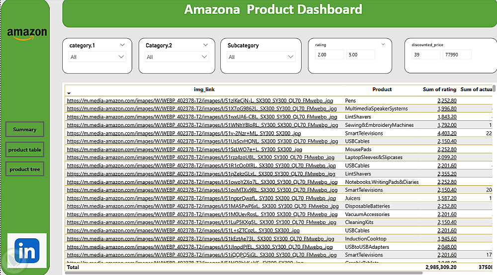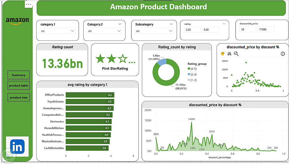 تصميم وتطوير لوحة تحكم تفاعلية (Dashboard) باستخدام Power BI لعرض وتحليل بيانات منتجات أمازون. يتضمن المشروع: