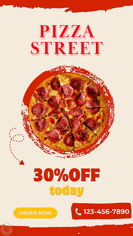 تصميم دعائي جذاب لإعلان بيتزا بخلفية بسيطة وملفتة، يبرز صورة بيتزا طازجة ولذيذة مع عرض خصم 30% وعناصر اتصال لطلب المنتج. التصميم احترافي ومثالي للمطاعم وحملات التسويق على وسائل التواصل الاجتماعي.