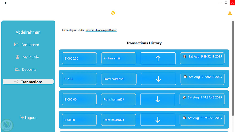 المعاملات المالية: إرسال واستقبال الأموال بين المستخدمين مع تسجيل العمليات.