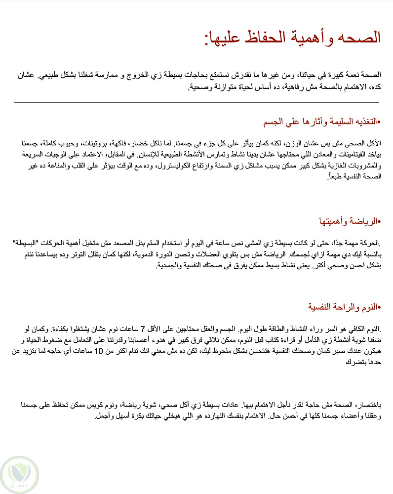 مقال حصري ومكتوب بأسلوب بسيط وجذاب عن الصحة وأهميتها في حياتنا اليومية. يتناول المقال نصائح للحفاظ على نمط حياة صحي، وأهمية التغذية السليمة، والنوم الجيد، والنشاط البدني، وتأثير العادات الصحية على الجسد والعقل. المقال مكتوب بلغة عربية سليمة، ومنسّق بعناوين واضحة وفق الفقرات لسهولة القراءة والفهم، مع مراعاة خلوه من الأخطاء الإملائية واللغوية.