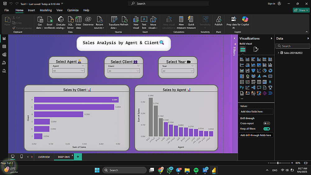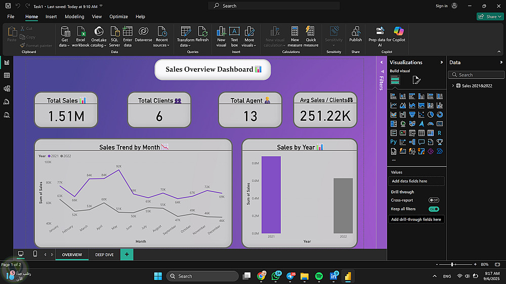 قمت بتصميم لوحتين معلومات تفاعليتين باستخدام Power BI لعرض وتحليل بيانات المبيعات بشكل احترافي يدعم اتخاذ القرار.