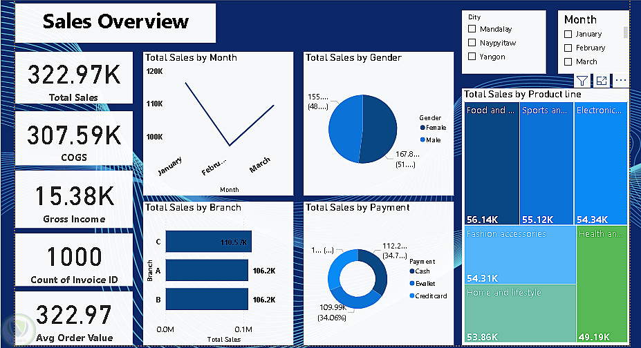 - مقارنة المبيعات حسب الفروع، طرق الدفع، وفئات المنتجات باستخدام مخططات شجرية (Treemap) ورسوم بيانية.