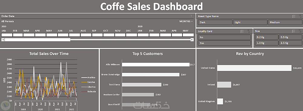 تُظهر لوحة المعلومات هذه أداء مبيعات القهوة خلال فترة زمنية تمتد من عام 2019 حتى مايو 2022، مع التركيز على المبيعات الإجمالية، أهم العملاء، والتوزيع الجغرافي للإيرادات.