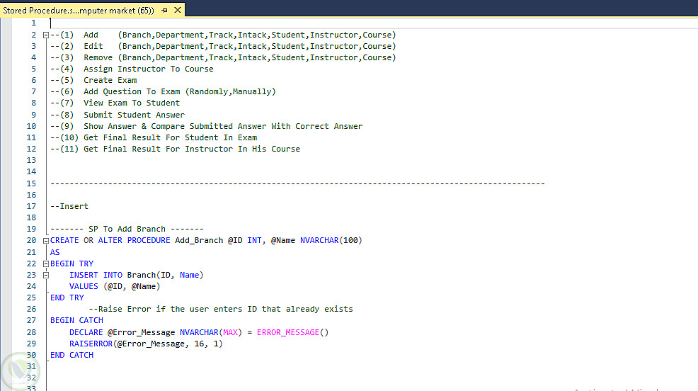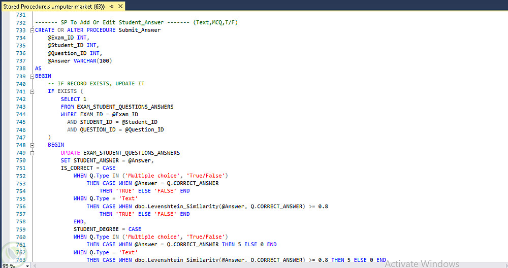 - حساب النتائج: إجراءات مخزنة (Stored Procedures) لحساب الدرجة النهائية للطالب في الامتحان وعرض نتائج الأداء على مستوى المقرر.