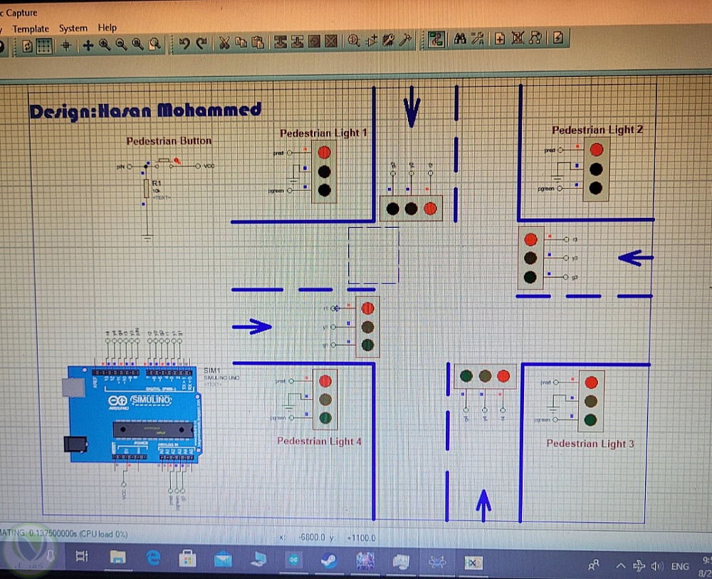 توضح الدارة في الصورة نظام تحكم بإشارات المرور الخاصة بالمشاة عند تقاطع طرق، بالاعتماد على لوحة أردوينو UNO مع برمجة من خلال Simulink.