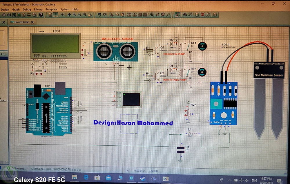 توضح الدارة نظام تحكم أوتوماتيكي في عملية ري النباتات بالاعتماد على لوحة Arduino UNO مع مجموعة من الحساسات والمكونات المساعدة:
