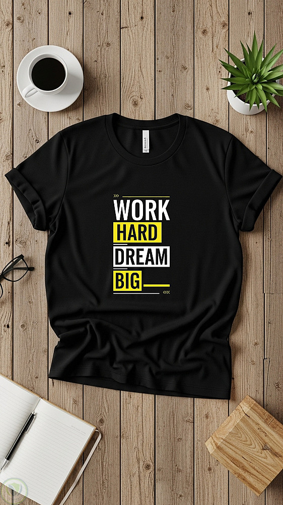 هذا تصميم حديث وبسيط لتصميم علي تيشيرت تحفيزي يحمل عبارة "WORK HARD DREAM BIG". تم إنشاؤه باستخدام أدوات الذكاء الاصطناعي وكانفا، ويتميز بخط واضح وعريض مع تباين لوني ملفت. كلمة "HARD" موضوعة داخل مربع أصفر للتأكيد، بينما كلمتا "WORK" و "DREAM BIG" باللون الأبيض على خلفية سوداء، مما يخلق تأثيرًا بصريًا قويًا.