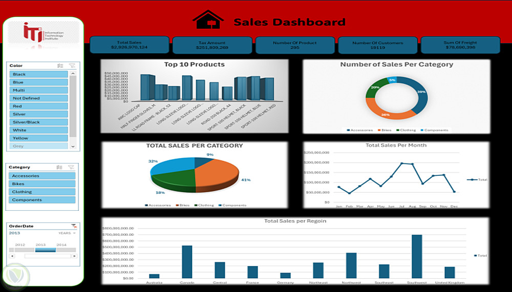 إضافة فلاتر (Slicers) لتصفية البيانات بسهولة حسب الفئة، اللون، أو التاريخ.