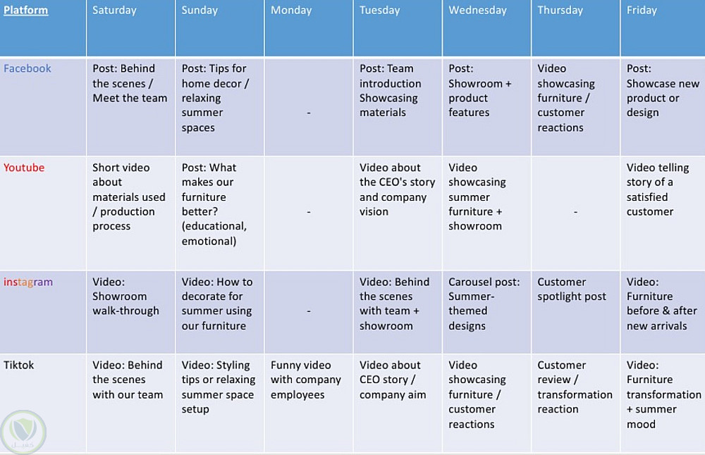 خطة محتوى اسبوعية لشركة اثاث على منصات فيسبوك و تيكتوك و انستجرام و يوتيوب مكونة من صور و فيديوهات