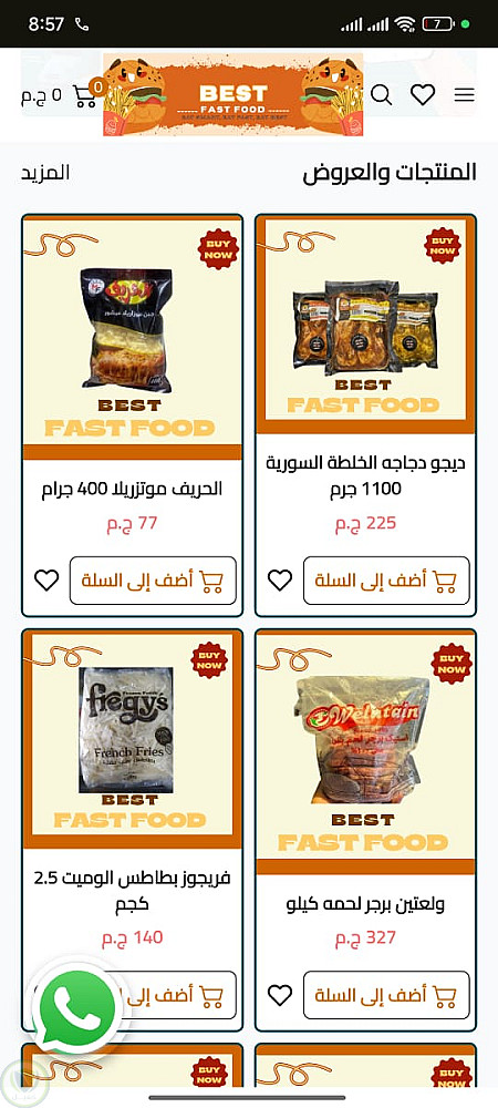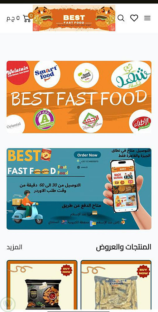 قمت بتصميم وتنفيذ متجر إلكتروني احترافي لمطعم Best Fast Food لبيع المنتجات الغذائية والوجبات السريعة والمجمّدات.