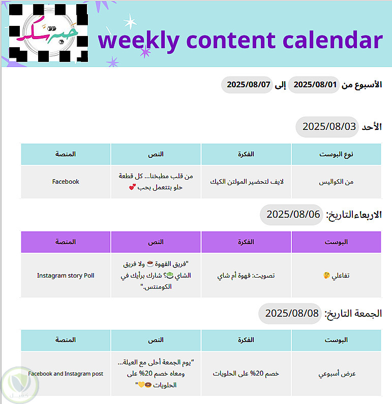 تصميم كالندر أسبوعي منظم وجاهز للاستخدام لكافية "حبة سكر"