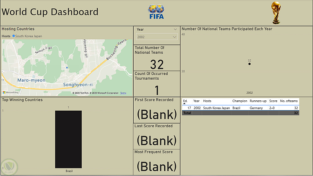 هذا المشروع يمثل تصميم وبناء لوحة بيانات تفاعلية وشاملة (Dashboard) لتحليل وإظهار البيانات التاريخية لبطولات كأس العالم لكرة القدم. تم تطوير اللوحة لتقديم نظرة عامة عميقة وسهلة الاستيعاب حول الإحصائيات الرئيسية، الدول المضيفة، الأداء التاريخي للدول، والأنماط المتعلقة بنتائج المباريات.