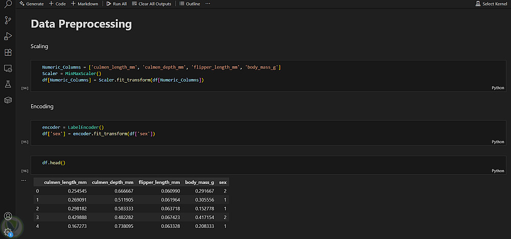 تنظيف البيانات ومعالجتها المسبقة: معالجة القيم المفقودة، وترميز المتغيرات التصنيفية، وقياس السمات العددية.