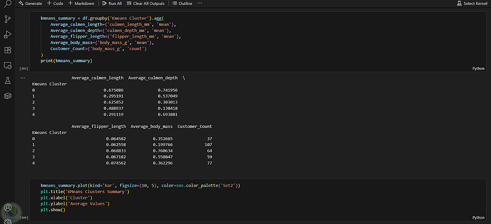يطبق هذا المشروع تقنيات التعلم الآلي غير المُشرف لتجميع أنواع البطاريق بناءً على خصائصها البيولوجية. تتضمن مجموعة البيانات قياسات فيزيائية مثل طول المنقار، وعمقه، وطول الزعانف، وكتلة الجسم، بالإضافة إلى سمات تصنيفية مثل الجزيرة والجنس.