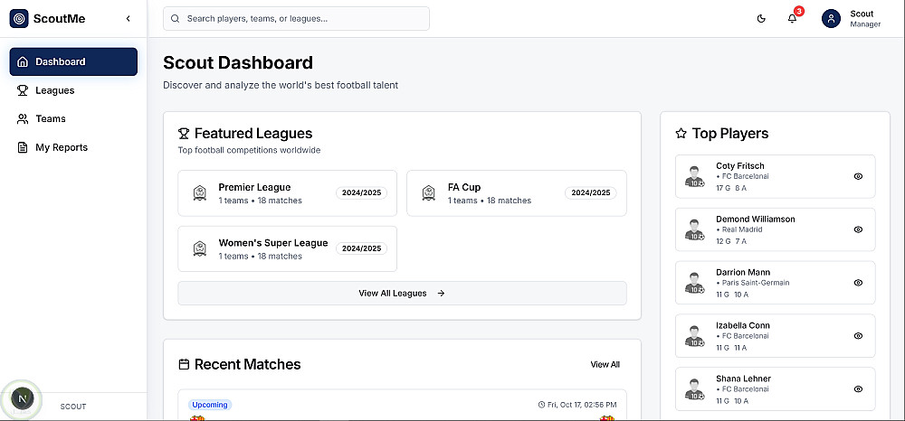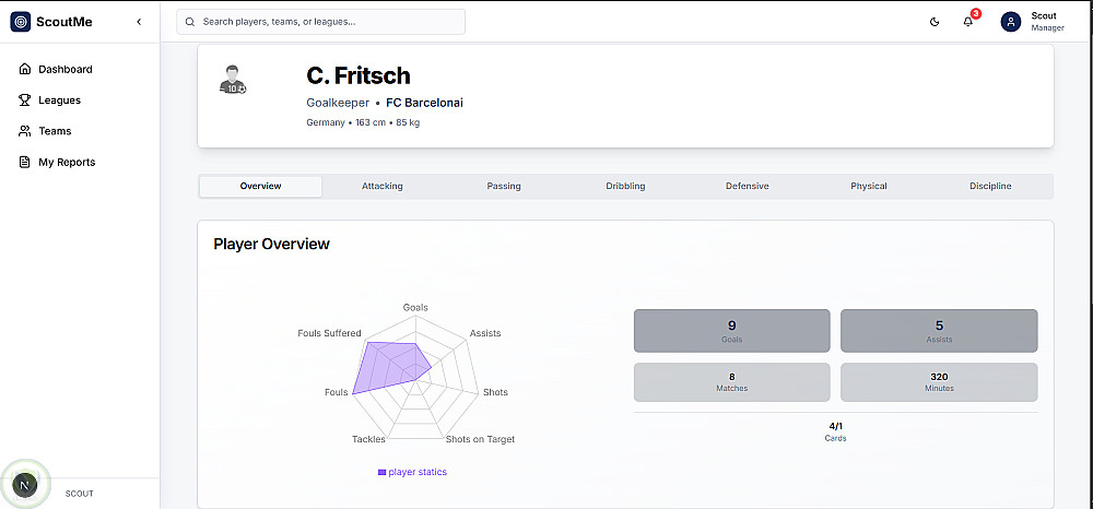 Scout Me هو مشروع لتحليل الأداء الكروي باستخدام تقنيات متطورة يقدم نظامًا ذكيًا لتقييم اللاعبين والفرق بشكل دقيق وتفاعلي.