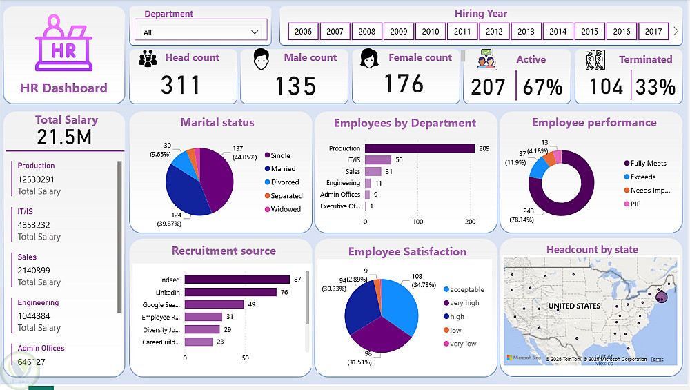 - تصميم لوحة متابعة تفاعلية باستخدام Power BI جمعت هذه المصادر في منصة واحدة، مما أتاح رؤية مباشرة للبيانات مثل أعداد الموظفين، معدل الدوران الوظيفي، الرواتب، كفاءة قنوات التوظيف، ورضا الموظفين.