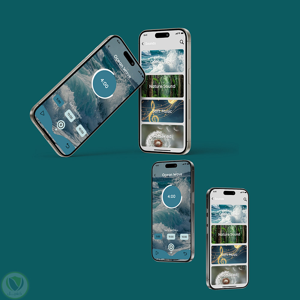 يقدم التصميم واجهة أنيقة وسهلة الاستخدام تتيح للمستخدم اختيار فئة الصوت التي يرغب بها مثل أمواج البحر، أصوات الطبيعة، الموسيقى الهادئة، والرياح الخفيفة.