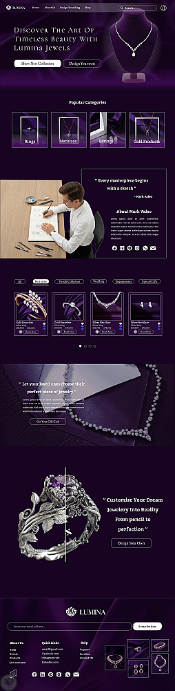 Lumina Jewels هي علامة تجارية فاخرة متخصصة في تصميم المجوهرات الراقية، تحتفي بالجمال الخالد والفخامة الهادئة. هدف المشروع كان تصميم موقع إلكتروني يعكس هوية العلامة المتميّزة، ويقدّم تجربة مستخدم أنيقة وغامرة تعبّر عن روح الرفاهية والرقي التي تميز العلامة.