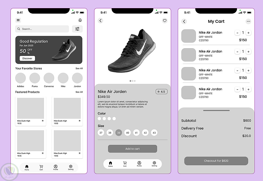 يعرض هذا المشروع تصميم Wireframe بسيط ومنظّم لتطبيق مخصص لبيع الأحذية عبر الإنترنت.