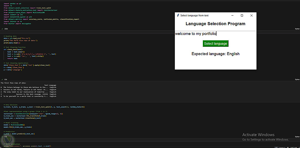 بنيت نظامًا للتعرف على لغة النصوص (إنجليزية، فرنسية، عربية) باستخدام خوارزمية Naive Bayes. يعتمد المشروع على تحليل خصائص النصوص واستخراج الأنماط لتصنيف اللغة بدقة عالية. هذا المشروع يبرز قدرتي في تطبيق تقنيات التعلم الآلي ومعالجة اللغات الطبيعية (NLP).